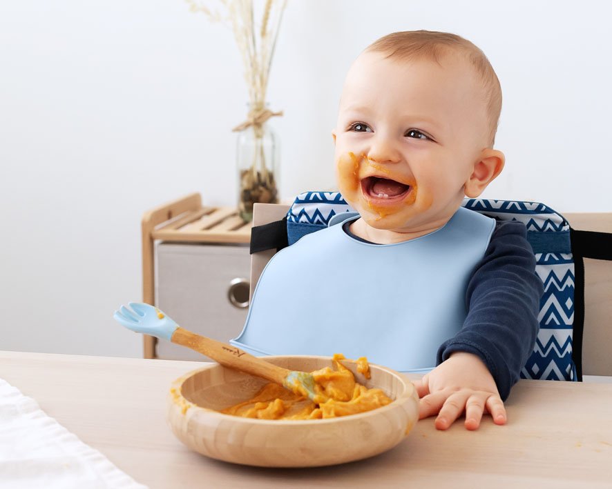 Ekologiškas bambuko ir silikono indų rinkinys mažyliams.