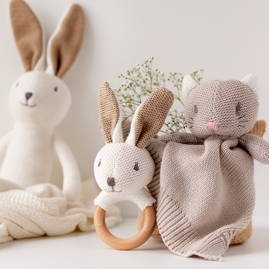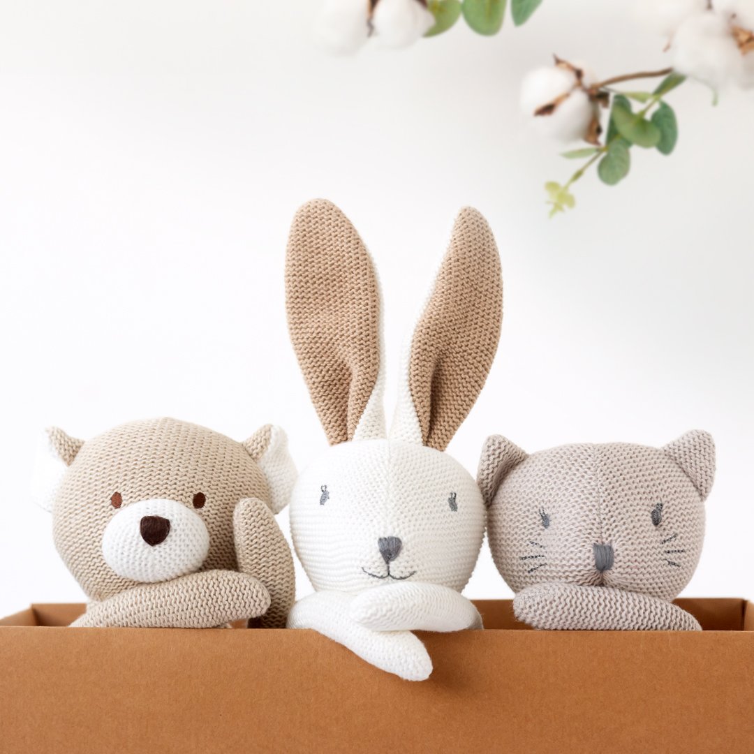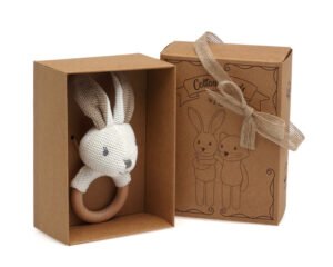 Dėl šios priežasties į savo kolekciją įtraukėme 100 % ekologiškos medvilnės žaislus „Zuikučius“, pagamintus atsakingai ir be plastiko. Kiekvienas žaislas supakuotas į perdirbamą kartoninę dėžutę, surištą natūralaus pluošto kaspinu – mažas, bet svarbus žingsnis link tvarumo.