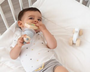 Leiskite savo kūdikiui atrasti naujas tekstūras, formas ir garsus su šiuo kruopščiai parinktu medinių žaislų rinkiniu. Švelnūs, užapvalinti elementai užtikrina, kad žaislus būtų lengva paimti, laikyti ir valdyti mažomis rankytėmis.