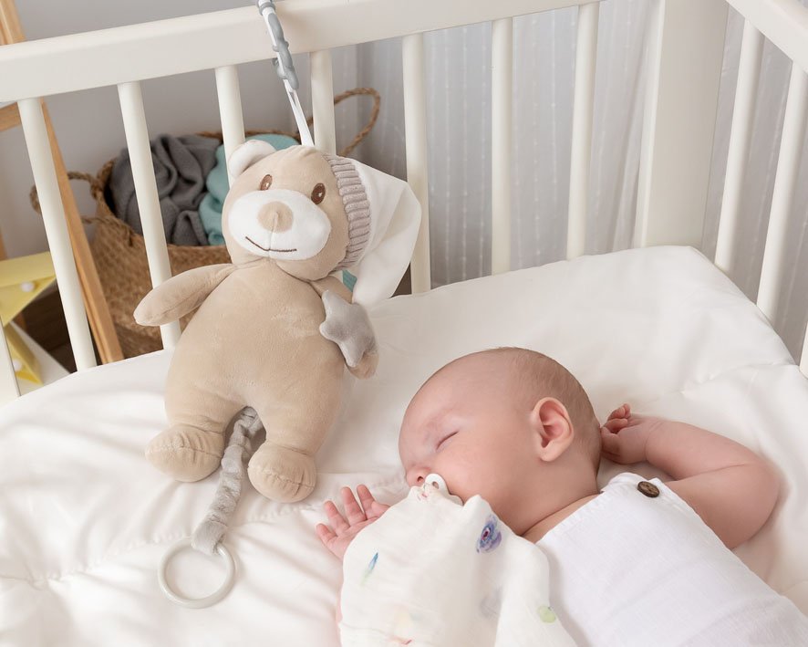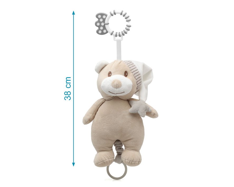 Šis švelnus ir mielas meškučio formos muzikinis žaislas – puikus pagalbininkas ramiam kūdikio miegui ir nusiraminimui. Jis ne tik guodžia, bet ir skatina sensorinį vystymąsi, nes kūdikis gali jį liesti, stebėti ir klausytis melodijos.